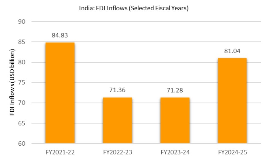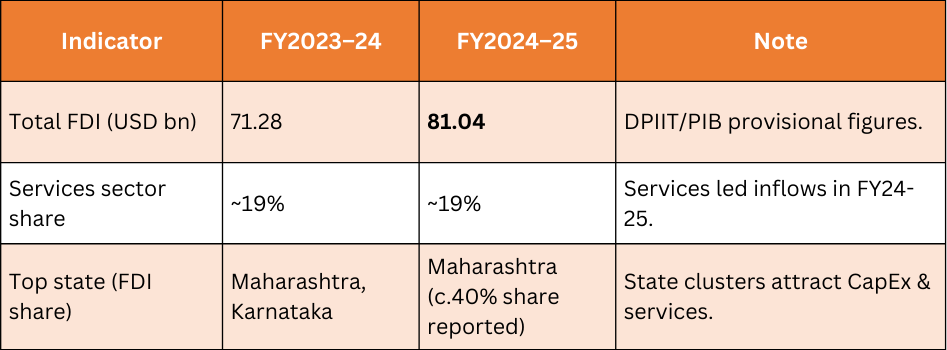 India recorded USD 81.04 billion in FDI inflows for fiscal year 2024–25, a notable rise from the previous year and a strong signal of investor confidence. In the early months of FY 2025–26, equity inflows (April–June) continued to show momentum, with FDI equity rising about 13–15% year-on-year in Q1, indicating sustained interest across services and tech-related sectors.